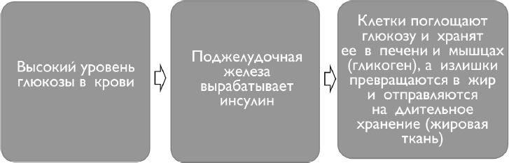 Организм вырабатывает инсулин, чтобы справиться с ростом уровня сахара в крови, вызванным приемом пищи (на самом деле даже просто попробовав еду, вы запускаете так называемую цефалическую фазу выработки инсулина (ЦФВИ). Об этом мы поговорим более подробно в главе 4). Инсулин – это гормон хранения, он помогает клеткам поглощать глюкозу из крови и временно хранить ее в печени и мышцах в виде гликогена. Если гликогена более чем достаточно, то его излишки преобразовываются и хранятся в виде жировой ткани.