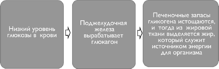 Постепенно уровень глюкозы в крови снижается (спасибо инсулину за работу!), и тогда поджелудочная железа вырабатывает противорегуляторный гормон под названием «глюкагон». Он заставляет печень высвобождать гликоген, чтобы снова повысить уровень глюкозы в крови, тем самым позволив нашему организму (в том числе и мозгу) нормально функционировать. Если «хранилища» гликогена пусты, организм переключается на запасы жира, припасенные как раз для таких экстренных случаев. Из жира начинают вырабатываться кетоны, которые служат эффективным топливом для мозга при отсутствии глюкозы.