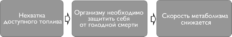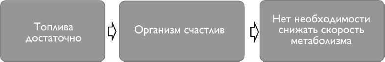 Говоря еще проще, происходит следующее. Вы израсходовали свои запасы гликогена (то есть у вас больше нет доступа к глюкозе, которая служит топливом для головного мозга) и при этом у вас высокий уровень инсулина (а значит, вы не можете эффективно сжигать отложенный жир для получения энергии). Что в таком случае будет делать организм, чтобы сэкономить силы? Поскольку он запрограммирован на жизнь, то снижение скорости метаболизма – отличная возможность не дать вам умереть от голода, пока вы будете искать себе пропитание (несмотря на то что у вас на боках хранится огромное количество топлива, припасенного как раз на такой черный день).