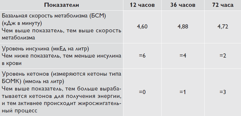 Мы видим, что в промежутке между 12-м и 36-м часом голодания у испытуемых произошло увеличение базальной скорости метаболизма (БСМ), а в промежутке между 36-м и 72-м часом этот показатель немного снизился. Это одна из причин, по которой я не рекомендую голодать более 72 часов. Несмотря на то что к 72-му часу БСМ выше, чем она была через 12 часов после начала голодания, она все равно идет на спад, то есть скорость обмена веществ снижается, а нам это совсем не нужно! Испытуемые голодали только 72 часа, поэтому мы не знаем, в какой момент БСМ опускается ниже стартовой отметки, но в любом случае тенденция к снижению дает нам понять, что рано или поздно это произойдет.
