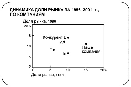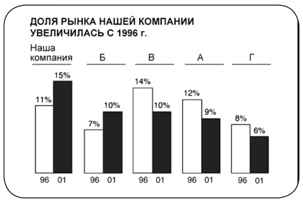 Наша доля рынка увеличилась на 4 %: с 11 % в 1996 г. до 15 % на сегодня. Среди наших четырех основных конкурентов компания Б также улучшила свое положение, в то время как доли рынка компаний В, A и Г уменьшились.