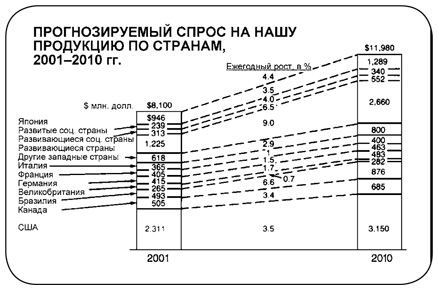 Фрэнк продолжает: «Основываясь на данных об объемах продаж, показателях рентабельности инвестиций и изменении доли рынка, мы рекомендуем сконцентрировать наши усилия на продвижении нашей основной продукции на рынках развивающихся стран. Мы считаем, что эти рынки обладают значительным потенциалом роста. Так как представленный график может быть не совсем понятен, позвольте мне пояснить. Я привел данные по объему мирового рынка в 2001 году и прогноз на 2010 год. Основываясь на серьезных исследованиях, мы предполагаем, что объем рынка вырастет с 8 до более чем 11 миллиардов долларов. Затем я привел отдельные данные по 11 странам, оперирующим на данном рынке, показав долю каждой. После этого я подсчитал среднегодовой темп роста для каждой страны и указал его в центре таблицы. Из этих цифр ясно, что самый быстрый рост рынка будет наблюдаться именно в развивающихся странах».