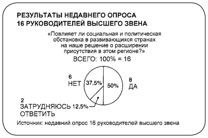 Фрэнк говорит: «Однако, если мы хотим развивать деятельность в этом направлении, сначала надо убедить наше высшее руководство в том, что политическая и социальная обстановка в выбранных нами развивающихся странах не будет мешать нашим планам. Недавно проведенный опрос 16 руководителей высшего звена показал, что их мнения по вопросу об инвестициях в эти страны разделились почти поровну».