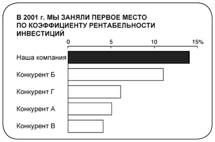 По сравнению с четырьмя нашими основными конкурентами мы занимаем первое место по коэффициенту рентабельности инвестиций (14 %) в 2001 г.