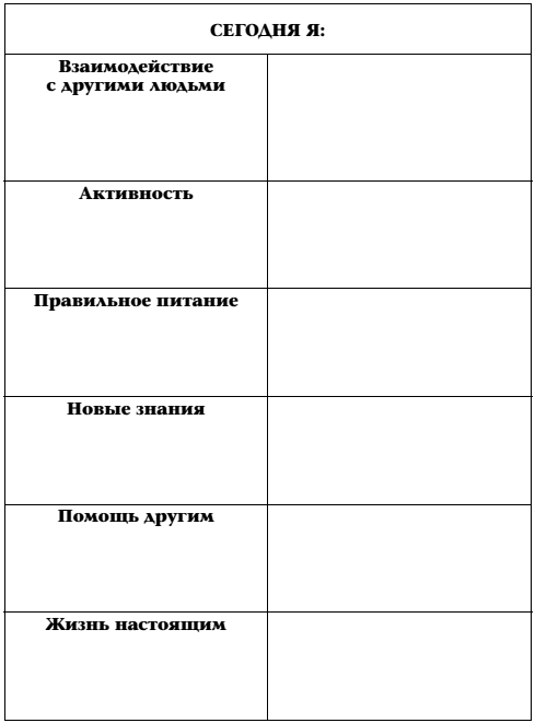 Здесь вы можете сформулировать планы на день. Постарайтесь записать хотя бы по одному пункту в каждой графе.