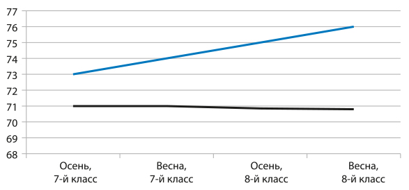 В ходе исследований Кэрол Дуэк и ее коллег было установлено, что примерно у 40 % детей отмечается пагубное фиксированное мышление и они убеждены, будто интеллект – дар, который «либо есть, либо нет». 40 % учеников свойственно мышление роста, а оставшиеся 20 % демонстрируют признаки обоих типов мышления (Dweck, 2006b). Ученики с фиксированным мышлением чаще легко сдаются, а ученики с мышлением роста продолжают трудиться, даже если им приходится постоянно выполнять нелегкую работу, демонстрируя при этом качество, которое Анджела Дакворт называет твердостью характера (Duckworth & Quinn, 2009). В ходе одного исследования учеников седьмого класса был проведен опрос для определения типа мышления. Потом исследователи на протяжении двух лет отслеживали успеваемость этих учеников по математике. Результаты оказались впечатляющими: успеваемость учеников с фиксированным мышлением оставалась на прежнем уровне, а у учеников с мышлением роста она постоянно повышалась (Blackwell et al., 2007; рис. 1.1).