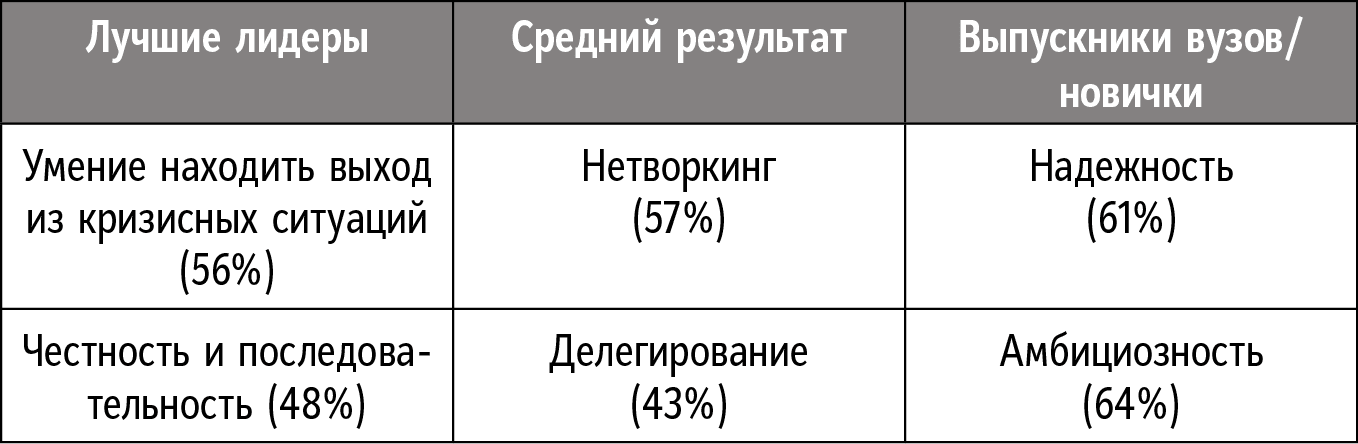 Взгляните на табл. 2. Она опирается на исследование, в ходе которого респондентам задали вопросы: «Какими качествами должны обладать лидеры?» и «Довольны ли они своими лидерами?» Здесь перечислены пять основных требований к хорошему лидеру на каждом уровне организации (процент удовлетворенности указан в скобках).