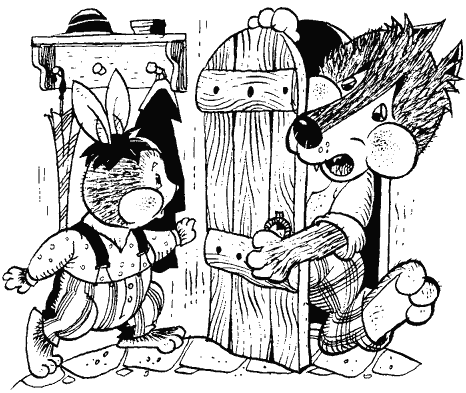 Вот как-то собрался Братец Кролик проведать Братца Енота, да вдруг слышит страшный шум и топот на дороге. Он и ухо насторожить не успел, как в дверь вбежал Братец Волк. Крольчата мигом в подвал.