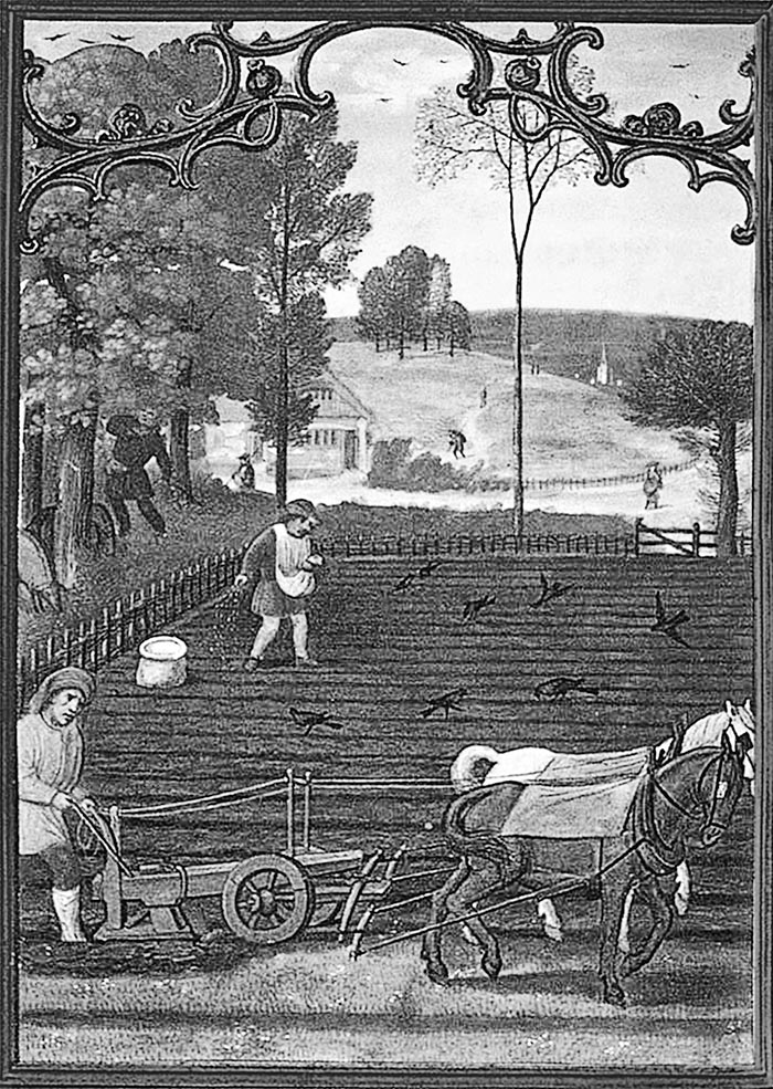 РИС. 4. Два изобретения, совершивших революцию в средневековом сельском хозяйстве: колесный плуг и хомут. Источник: Часослов Симона Бенинга Da Costa Hours. Брюгге, 1515.