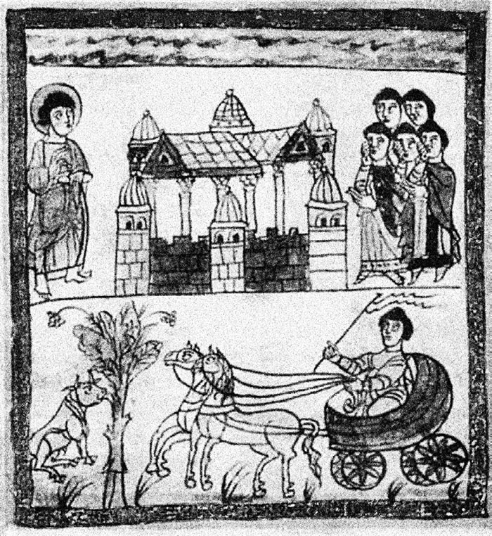 РИС. 6. Древнейшее изображение лошадиной упряжки, относящееся примерно к 800 г. Источник: Трир, Apocalypse, Городская библиотека, MS. 31, fol. 58r.