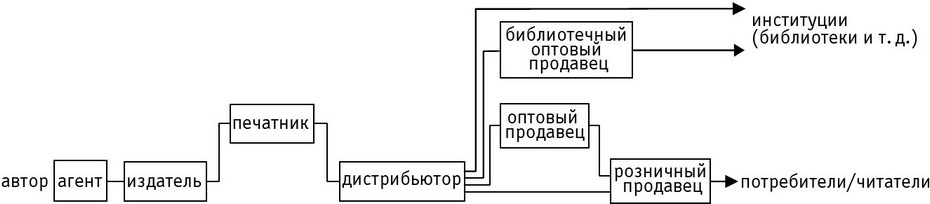 Помимо понятия поля, есть еще одно понятие (или набор понятий), которое нам необходимо для понимания мира массового книгоиздания, – издательская цепочка. Издательство – лишь один из игроков в поле, и то, как издательства связаны с другими игроками, определяется цепочкой действий, в которой разные агенты или организации выполняют разные роли, ориентированные на общую цель – производство, продажу и распространение культурного товара под названием «книга».