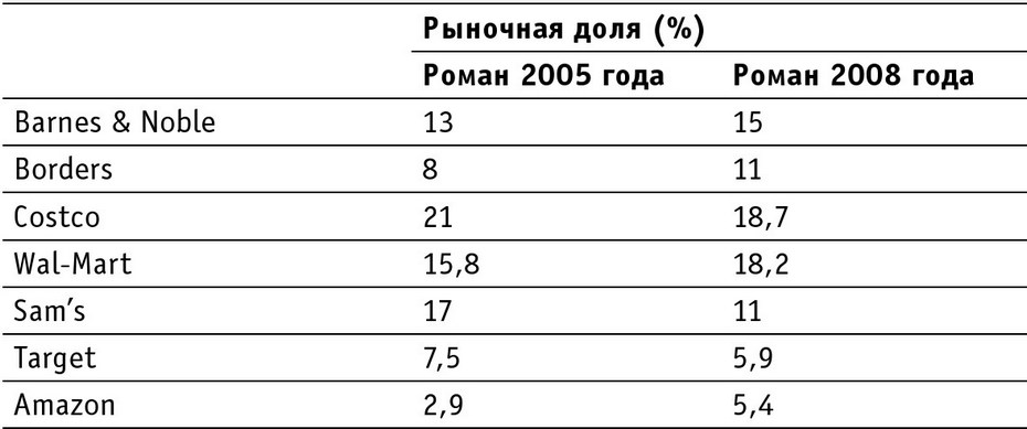 В таблице 2 показана рыночная доля крупнейших розничных продавцов США в случае двух самых продаваемых романов ведущего автора коммерческой художественной литературы. Одна книга была опубликована в 2005 году, другая – в 2008-м; цифры отражают продажи изданий в твердом переплете в течение первых трех недель после публикации. Хотя рыночные доли обоих продавцов в двух случаях несколько различаются, общая картина очевидна: крупнейшей продавец – Costco (21% рынка в случае книги 2005 года и 18,7% – в случае книги 2008 года); следом идут Wal-Mart и Sam’s (который принадлежит Wal-Mart) с рыночной долей 15,8 и 18,2% в случае Wal-Mart и 17 и 11% в случае Sam’s. В совокупности на долю магазинов смешанного ассортимента (включая Target) приходится более половины продаж этих книг в течение первых трех недель – 61,3% в 2005 году и 53,8% в 2008-м. Рыночная доля Barnes & Noble составила 13% в 2005 году и 15% в 2008‐м, в то время как у Borders она была 8 и 11%. В совокупности на долю сетей книжных суперсторов пришлась примерно четверть продаж (21% в 2005 году и 26% в 2008-м). Доля Amazon выросла с 2,9% в 2005 году до 5,4% в 2008-м. Эти семь продавцов – четыре ключевых магазина смешанного ассортимента, две сети книжных суперсторов и Amazon – обеспечили 85% продаж этих двух бестселлеров в твердом переплете в течение первых трех недель после публикации. На все оставшиеся торговые точки, включая остальные сети, такие как Books-A-Million, и все независимые книжные магазины вместе взятые, пришлось только 15% продаж.