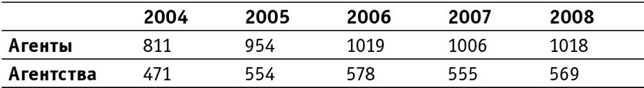 Таблица 5. Количество агентов и агентств в зарегистрированных сделках, 2004–2008 годы