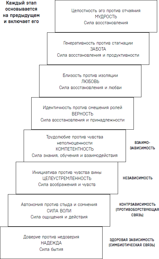 Кроме того, мы должны быть достаточно самостоятельными, чтобы доверять самим себе, когда мы покидаем безопасный дом наших родителей. Наш успех при этом зависит от того, насколько мы побороли нашу зависимость от других в раннем детстве и насколько мы успели сформировать нашу идентичность на дошкольном этапе развития, призывающем нас к независимости. Чем лучше мы справимся с решением этих задач в процессе нашего развития, тем легче нам будет инициировать каждый новый переходный этап.