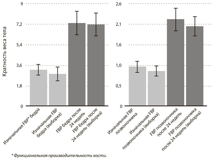 Вы можете увидеть кардинальные изменения на приведенном далее графике (на нем прослеживается разница между показателями выходной силы бедра и позвоночника в точке отсчета и после процедур, длившихся двадцать четыре недели).