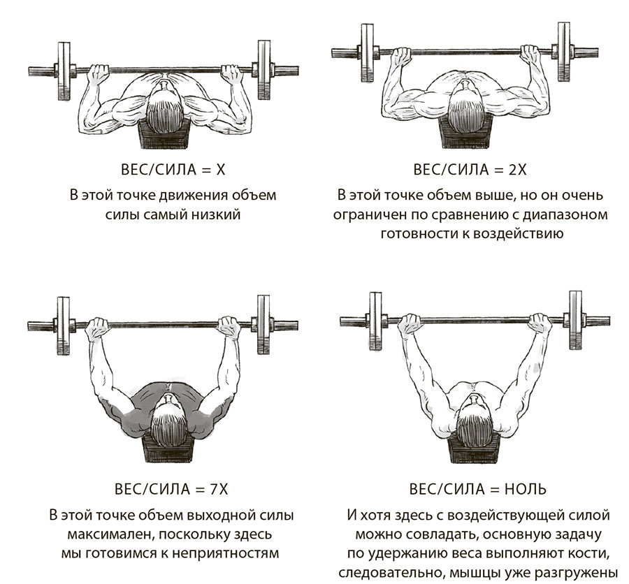 Возьмем жим лежа. Самый слабый диапазон значений приходится на момент, когда руки полностью согнуты в момент начала жима, а гриф штанги находится прямо у вас на груди. Средний диапазон достигается в середине упражнения, когда штанга находится на полпути между низшей и высшей точками нахождения при повторении. Самый сильный диапазон при завершении повторения, когда руки практически полностью вытянуты, но суставы при этом не зафиксированы. В каждом диапазоне человек способен совладать с нагрузкой разного объема. Сильный диапазон – это тот, где движение дается проще всего и ощущается легче всего, и в соответствии с этим ощущением легкости в этом диапазоне у мышц есть максимальный потенциал, чтобы выработать силу.