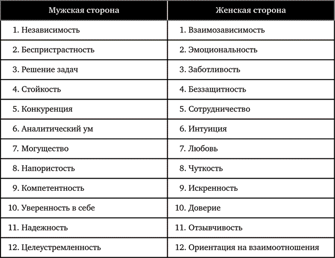 Ниже приведены двенадцать качеств (или характеристик) мужского и женского начал. На этих страницах вы встретите слова «стороны», «начала», «качества», «свойства» и «характеристики», но это лишь для разнообразия: на самом деле все они означают одно и то же и вполне взаимозаменяемы. Разумеется, на практике качеств гораздо больше, но для простоты и ясности я выделил всего двенадцать.