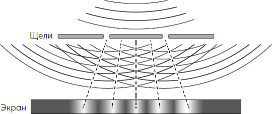 Пунктирные линии показывают, в каких местах волны взаимно усиливаются, образуя на экране светлые пятна.