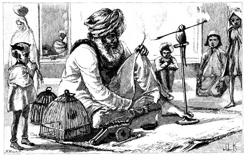 Попугая часто дрессируют для выступлений перед публикой. На улицах Дели я неоднократно видел одного попугая, совершавшего различные гимнастические и «воинские» упражнения. Он вращал маленькую лучинку, оба конца у которой были зажжены, заряжал крошечную пушку и стрелял из неё, притворно падал замертво и снова вскакивал целым и невредимым и всё это делал с уморительным энтузиазмом и удовольствием, которое едва ли можно приписать кусочкам лакомства, которые голодный попугай получал в качестве вознаграждения за каждый выполненный трюк. Редко когда попугай приручённый местными жителями говорит на самом деле хорошо. Индийцы легко довольствуются зачаткам речи у попугая и, хотя и они могут потратить время на его обучение, но склонны думать, что речь попугая это, как говорил Догберри[10], дар врождённый, а не приобретённый. Более того, индийские попугаи имеют меньшую природную способность к речеобразованию, чем настоящие говорящие попугаи из других стран.