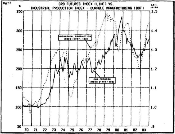Например, там указывается, что значения индекса CRB тесно связаны с динамикой индекса объема промышленного производства, в том смысле, что индекс фьючерсных цен, как правило, предвосхищает изменение значений второго индекса. В статье говорится: «Очевидная взаимосвязь между значениями индекса CRB и индекса объема промышленного производства указывает на эффективность индекса CRB как широкого экономического индикатора». (Стивен Кокс «Индекс фьючерсных цен CRB – потребительская корзинка из 27 наименований товаров, которая в скором будущем может стать предметом фьючерсных контрактов», с. 4.) От себя я могу лишь добавить, что мы вычерчиваем графики и анализируем динамику индекса CRB вот уже много лет, и всегда с неизменным успехом.
