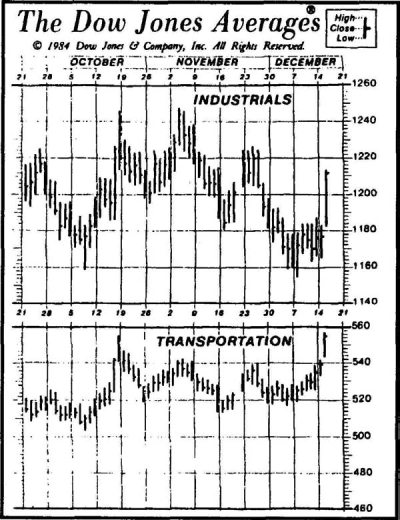 Рис. 2.1 Обратите внимание, что в результате недавнего спада значения промышленного индекса (industrials) опустились ниже ноябрьского минимума. Однако данный сигнал не получил подтверждения со стороны транспортного индекса (transportation), значения которого остались выше соответствующего минимума. Это означает, что краткосрочный медвежий сигнал промышленного индекса не заслуживает доверия. Только что значения транспортного индекса совершили прорыв вверх, то есть пере крыли уровень предыдущего пика. Для того чтобы подтвердить этот прорыв, промышленному индексу необходимо преодолеть свой уровень сопротивления