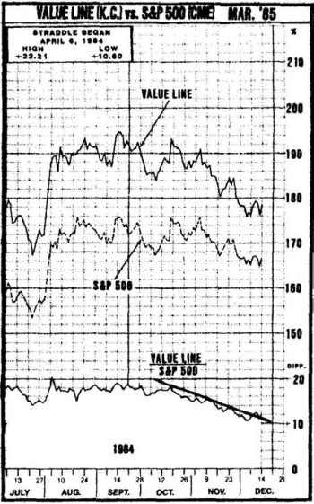 Рис. 2.2 Принцип подтверждения можно применять только по отношению к двум рынкам или индексам. На этом графике отражен спред (разница) между индексом Value Line и индексом S&P 500. Обратите внимание, что индекс S&P 500 только что прошел свой октябрьский минимум, дав слабое подтверждение медвежьего прорыва индекса Value Line, произошедшего несколько раньше. График спреда внизу наглядно демонстрирует, что индекс Value Line в последнее время был значительно слабее, что обычно является индикатором слабости рынка. Однако отметим, что спред начинает усиливаться (прорыв нисходящей линии тренда), сигнализируя о возможном повороте рынка вверх. Другими словами, индекс Value Line начинает опережать индекс S&P 500, а это обычно является показателем сильного рынка