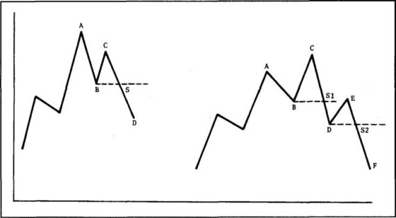 а) Модель «неудавшийся размах». Пик С оказался ниже, чем А, а в результате последующего падения произошел прорыв уровня спада В. В данной ситуации в точке S регистрируется сигнал к продаже