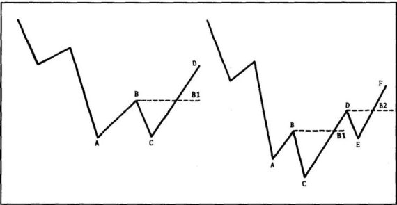 а) Модель «неудавшийся размах» в основании рынка. Прорыв уровня предыдущего пика (В) в точке В1 служит сигналом к покупке
