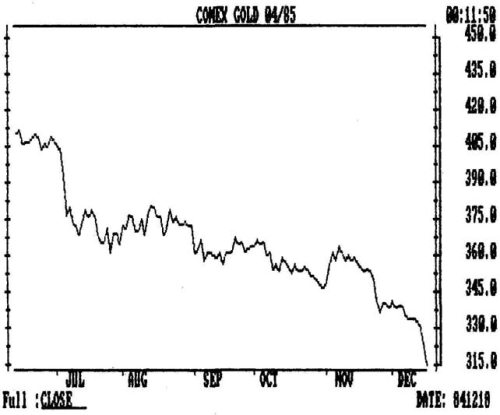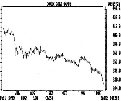Рис. 3.1 Дневной столбиковый график контракта на золото. Каждый вертикальный столбик соответствует движениям цены в течение одного дня. Наиболее часто используемыми являются максимальная цена дня, минимальная цена дня и цена закрытия. Некоторые аналитики также отмечают цену открытия. Для этого служит черточка слева от столбика