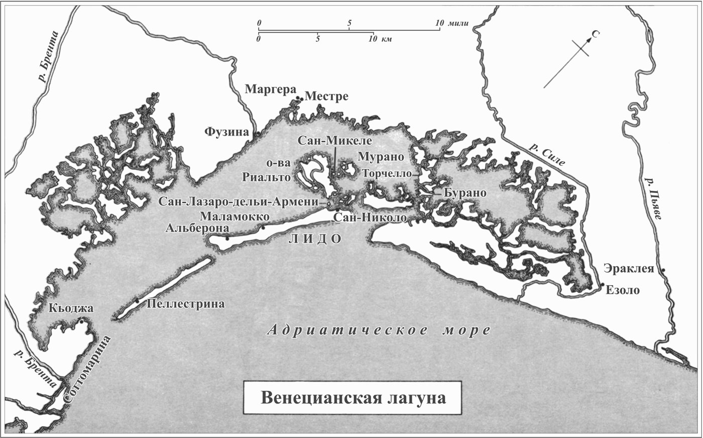 Они, что в страхеБежали от того, кто похвалялся:«Где конь ступал мой – не растет трава», —Они Венеции начало дали,Как чайки, гнезда свили на волнах,И в месте том, где на простореГнал ветер с севера на юг песок,Возвысился спустя десятилетья,Поднявшись будто из морских пучин,Прекрасный град, весь в золотистых шпилях,В сиянии церковных куполов,Обитель света, славная твердыня,Оплот людской на многие века.Сэмюел РоджерсВряд ли найдется другой такой большой город, которому удалось бы со всей полнотой сохранить первоначальную атмосферу и cоздавшие его традиции. Путешественник, приближающийся к Венеции по морю – а вид, открывающийся с водной глади, самый впечатляющий – либо по суше, через мост, или даже подлетающий к городу по воздуху, видит все ту же плоскую, пустынную водную поверхность, болота, поросшие тростником. Эти места облюбовали первые венецианцы. Каждый раз поражаешься даже не невозможности, а безрассудной храбрости такого предприятия. Это – удивительный мир, мир Венецианской лагуны. Около двухсот квадратных миль соленой воды, по большей части такой мелкой, что человек может пройти по ней, погрузившись по пояс. Однако она пересечена глубокими каналами, и многие столетия венецианцы прокладывают по ним путь к открытому морю. Здесь множество островов, образованных илом. Его принесли сюда Брента, Силе и другие реки. В песчаное дно вбиты бесчисленные ряды вех, отмечающие невидимые, но важные особенности – отмели, месторасположение плетеных ловушек для омаров, районы промысла рыбы, остатки кораблекрушения, кабели, якоря. Вехи указывают vaporetti3 безопасный маршрут. Вапоретти снуют между городом и островами. В любое время года, при любом освещении вода на удивление светла. Лагуна не очень глубока, и поэтому здесь вы не увидите ни темно-синей бархатистости Средиземного моря, ни терпкой зелени Адриатики. И все же, особенно в осенние вечера, ее поверхность блестит, словно масло, под низким туманным солнцем. Вода выглядит на редкость красиво, и удивляешься тому, что великие венецианские художники, завороженные великолепием своего города, так мало внимания уделяли его окрестностям. Голландцы бы на их месте не растерялись! Впрочем, венецианская школа всегда отличалась жизнерадостностью; лагуна же, несмотря на свою красоту, невыразимо печальна. Задаешься вопросом: уж не сошли ли люди с ума? Зачем они оставили плодородные равнины Ломбардии и поселились на болотистых малярийных берегах, на песчаных островках, на ползучем пырее, зачем добровольно сделались игрушками капризной водной стихии?