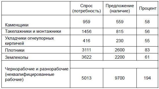 Все время не хватало квалифицированных рабочих. Это происходило в основном по вине той организации, в функции которой входила подготовка квалифицированных кадров, а также вследствие того факта, что индустриализация в других частях страны мешала набирать в большом количестве квалифицированных работников из других промышленных центров. Следующая таблица дает представление о положении с рабочей силой в начале 1933 года: