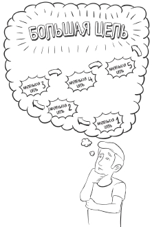 Несколько лет назад я набрал очень большой вес, и тогда я поставил перед собой цель – сбросить примерно 45 кг. Эту цель я разбил на несколько мелких: я решил сбрасывать каждую неделю по два кг. Каждую неделю я выполнял одну из подцелей, и это помогло мне приблизиться к выполнению моей главной цели.
