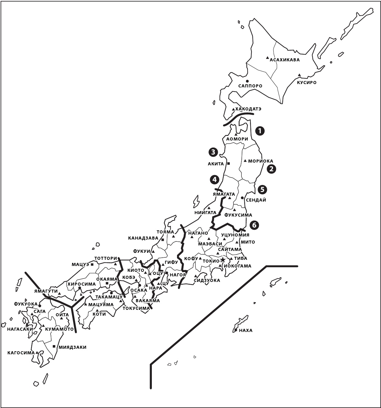 Японский регион Тохоку состоит из таких префектур, как Аомори (1), Иватэ (2), Акита (3), Ямагата (4), Мияги (5) и Фукусима (6).
