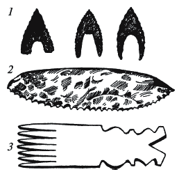Рис. 5. Предметы быта додинастического периода: 1 — наконечники для стрел; 2 — зазубренное лезвие ножа; 3 — гребень из кости