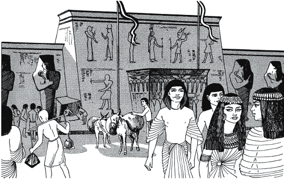Если бы вы смогли побывать в Фивах, Мемфисе или Тель-эль-Амарне, вы бы оказались в веселом, бурлящем и очень деловом мире (рис. 8). Безусловно, вы увидели бы там памятники и башни – не такие обветшалые, как сейчас, а гладкие, блестящие и сияющие. И в те дни их можно было видеть только за окружавшими их ограждениями или сквозь живой щит из листьев пальм и акаций.