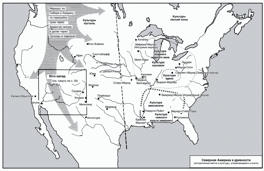 Как уже отмечалось, в те времена, когда пришельцы из Азии спускались по восточным склонам Скалистых гор, своего рода лестнице, в глубь континента, климат на юго-западе был влажным и очень благоприятным для плодородия почв. Путь пришельцев как раз пролегал через эти районы, где в изобилии водились животные, служившие главным источником пропитания. Две самые ранние американские культуры названы по имени мест, расположенных на юго-западе; когда же во время архаического периода климат изменился в неблагоприятную сторону и район превратился в засушливый, его жители проявили немалую изобретательность и сумели сохранить как свою культурную самобытность, так и лидирующее положение среди районов распространения древнеамериканских культур.