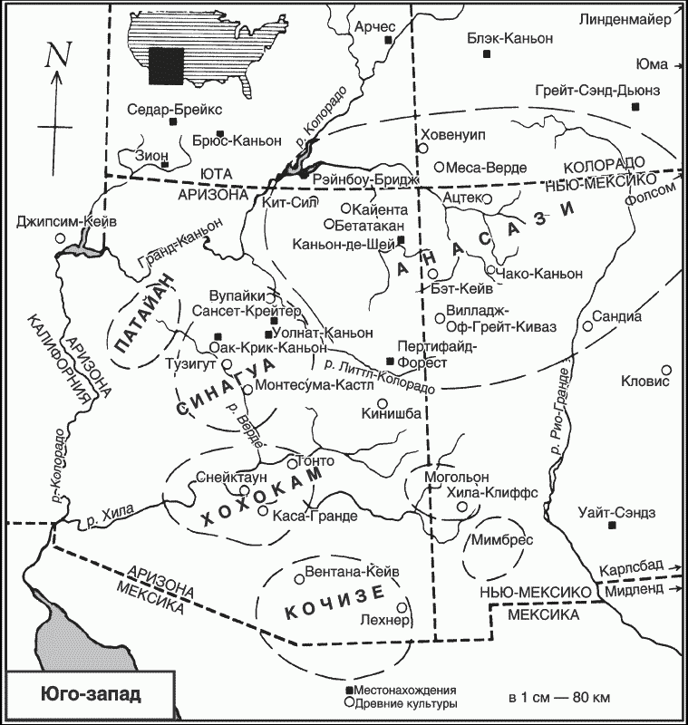 Археологи разделяют культуры, характерные для архаического периода, на две основные группы: восточную – «культуры лесной зоны», и западную – «культуры пустынь». В целом можно выделить пять основных районов распространения культур, которые тогда начинали складываться и которые определяли жизнедеятельность американских индейцев вплоть до начала XX столетия. Это следующие районы: юго-запад; лесная зона восточных районов, в которую входит район Великих озер, а также северо-восточные и юго-восточные районы; район Великих Равнин и прерии; Калифорния и прилегающий район Большого Бассейна; и наконец, северо-запад и прилегающие плоскогорья. Мы уделим специальный раздел каждому из этих районов; хотя в Северной Америке не было цивилизаций, сравнимых с центрально– и южноамериканскими, но именно архаический период был настоящим «золотым веком» древней североамериканской культуры. Когда мы сегодня говорим об индейцах Северной Америки, то рассматриваем их жизнь в течение последних трех столетий – то есть когда они уже вступили в контакт с европейцами. Однако это уже было время их упадка и деградации. Именно в предшествующие 3000 лет индейская культура достигла вершины своего расцвета, а наиболее впечатляющих успехов – на юго-западе, с которого мы и начнем наше описание.