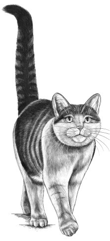Иногда он именно так и поступает, и тогда мне приходится выслеживать его, чтобы вернуть домой. Когда я еще далеко, он не узнает меня и выглядит настороженным (коты не так хорошо видят на расстоянии, как люди, хотя, вполне возможно, он в свойственной котам манере просто делает вид, что не знаком со мной). Но стоит мне приблизиться и ласково окликнуть его: «Нельсон, дружок», как он тут же идет, а порой даже бежит ко мне. Когда кот уже близко, его хвост взлетает вертикально вверх, превращаясь в выглядывающий из-за спины восклицательный знак, а когда он подходит ко мне вплотную, то принимается тереться головой и боками о мои ноги и непрерывно мурлыкать. Случается, что и дома в порыве нежности он ведет себя точно так же: подходит, держа хвост трубой, лижет мне руки и ноги в обмен на поглаживание, а порой даже перекатывается на спинку, подставляя животик. Такое поведение знакомо большинству из тех, у кого дома живут миролюбивые коты.