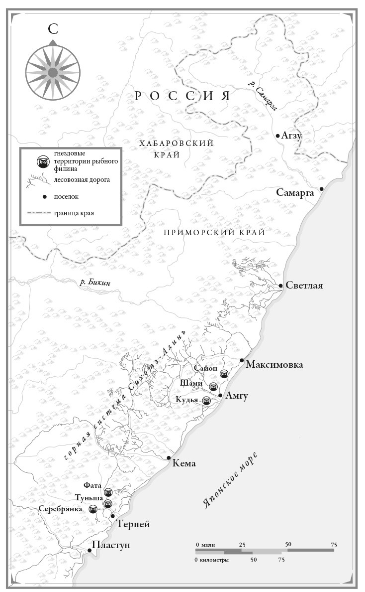 Защитив в 2005 году в Университете Миннесоты дипломную работу{4} о влиянии лесозаготовок на жизнь певчих птиц Приморского края, я стал искать связанную с этим регионом тему для кандидатской диссертации. Меня интересовали вопросы сохранения живой природы, и список видов быстро сузился до черного журавля и рыбного филина – двух наименее изученных и наиболее притягательных пернатых, обитающих в этом регионе. Рыбные филины нравились мне больше, но, зная, насколько скудны сведения о них, я беспокоился, что численности птиц окажется недостаточно для полноценного исследования. Пока я раздумывал над этим, мне случилось отправиться на несколько дней в поход по лиственничным марям – открытому заболоченному пространству с чахлыми деревцами, которые росли на равном расстоянии друг от друга, возвышаясь над густым ковром из душистого багульника. Поначалу мне там понравилось, но спустя какое-то время отсутствие укрытия от солнца, головная боль от тяжелого аромата багульника и тучи гнуса меня доконали. Тут меня осенило: это же типичная среда обитания черного журавля. Да, рыбный филин – птица редкая, и тратить на него время и силы рискованно, но мне хотя бы не придется провести следующие пять лет, таскаясь по заболоченным лиственничным лесам. Мой выбор пал на рыбного филина.