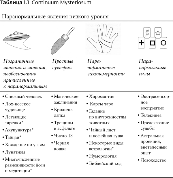 Некоторые суеверия более масштабны, чем другие. Носиться с волшебной кроличьей лапкой не так опасно, как из-за астрологического прогноза отправиться на войну. Мне представляется разумным разбить сообщения о паранормальных и сверхъестественных явлениях на восемь групп, расположение которых в continuum mysteriosum (пространстве тайн) определяется той степенью, в которой они противоречат естественным взглядам физической науки на вещество и энергию. Не слишком серьезные паранормальные явления (или сообщения о паранормальных явлениях низкого уровня) располагаются на шкале слева, а паранормальные явления высокого уровня – справа. Вы можете убедиться, что явления высокого уровня более всеобъемлющи, сложны и организованны. Сомнению подвергается все больше аспектов окружающего мира, паранормальные явления все более разнообразны и организованы в абстрактные системы верований, совершенно не связанные с реальностью. Паранормальные процессы низкого уровня влияют на окружающий мир в очень ограниченной степени, тогда как явления высокого уровня потенциально способны изменить мир.