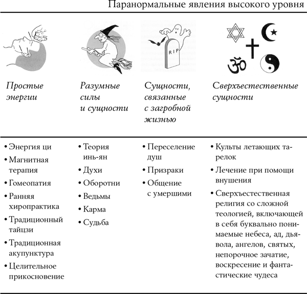 * Многие паранормальные явления могут быть представлены в нескольких вариантах и классифицироваться по-разному. К примеру, утверждение о том, что акупунктура вызывает выработку в мозгу эндорфинов, не является паранормальным. Неопределенное утверждение о том, что акупунктура активирует туманную энергию тела, можно классифицировать как утверждение о простой энергии. Утверждение о том, что расположение звезд в момент рождения человека содержит информацию о его личности и будущем, относится к паранормальным закономерностям. Однако если говорится, что звезды обладают некой таинственной силой, способной повлиять на земную жизнь, то здесь речь идет уже о паранормальной энергии.