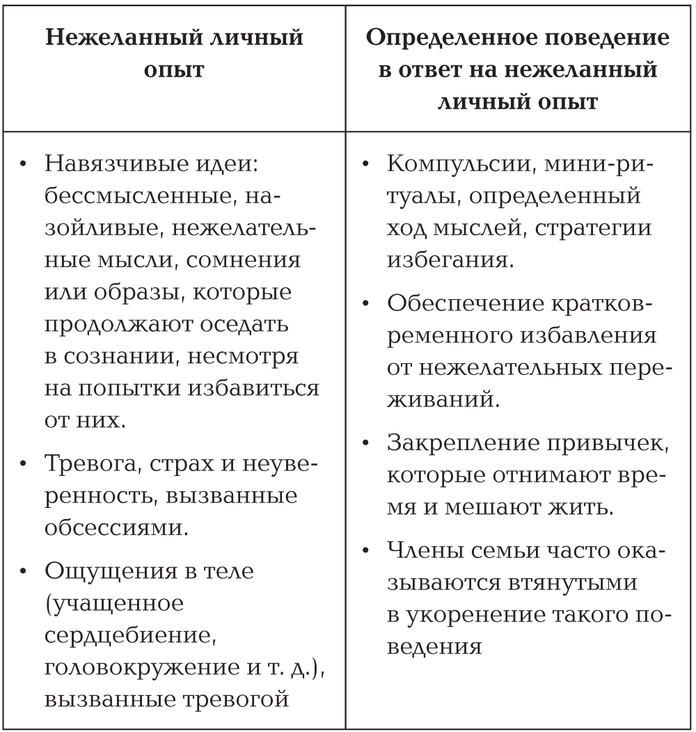 Несмотря на то что повторяющиеся ритуалы и стратегии избегания иногда помогают контролировать или уменьшать навязчивые идеи в краткосрочной перспективе, в долгосрочной они, как правило, не срабатывают; поэтому ваш близкий замечает, что все чаще повторяет одни и те же действия и прокручивает однотипные мысли. Со временем эти паттерны становятся все более значимыми в жизни человека. Может быть так, что значительная часть дня уходит на борьбу с обсессиями и выполнение ритуалов. Возможно, это мешает или отвлекает человека от других важных или ценных занятий, таких как домашние дела, присмотр и уход за детьми, работа, физические упражнения, отпуск, интимная близость или просто пребывание в настоящем моменте. И вполне возможно, что эта книга привела вас к тому, что эти компульсии занимают большую часть и вашей жизни тоже.