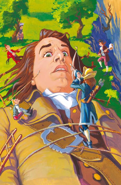 Но скоро человечки опять расхрабрились и снова стали карабкаться вверх по его ногам, рукам и плечам, а самый смелый из них подкрался к лицу Гулливера, потрогал копьём его подбородок и тоненьким, но отчётливым голоском прокричал: