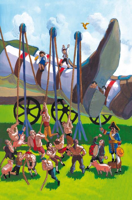 Через час им удалось поднять Гулливера с земли на полпальца, через два часа – на палец, через три – они взвалили его на телегу.