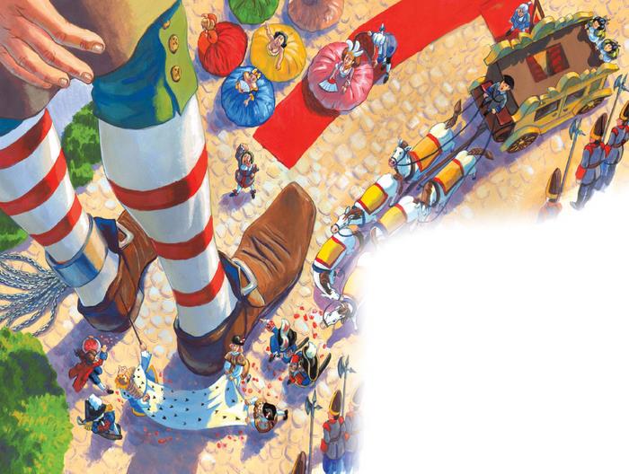 Гулливер увидел золотую коробочку на колёсах. Коробочку везла шестёрка белых лошадей. Рядом, тоже на белой лошади, скакал человечек в золотом шлеме с пером.