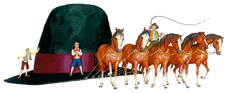Гулливер увидел золотую коробочку на колёсах. Коробочку везла шестёрка белых лошадей. Рядом, тоже на белой лошади, скакал человечек в золотом шлеме с пером.