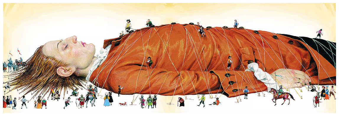 После вина Гулливеру сразу захотелось спать. Сквозь сон он чувствовал, как человечки бегают по всему его телу вдоль и поперёк, скатываются с боков, точно с горы, щекочут его палками и копьями, прыгают с пальца на палец.