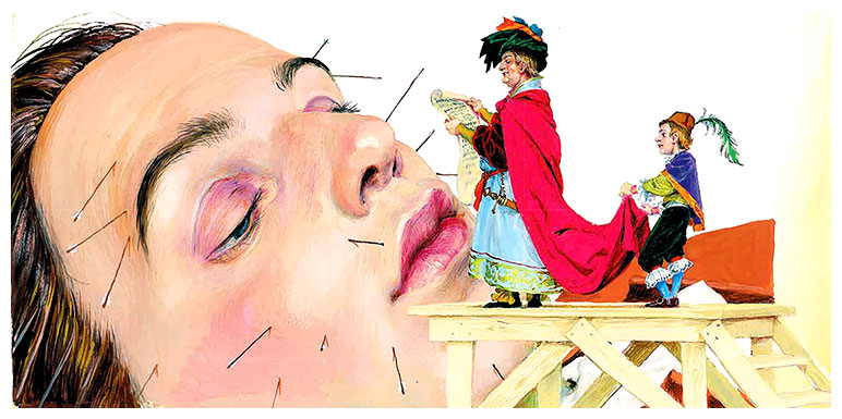 Гулливер слегка повернул голову – повернуть её больше не давали верёвочки и колышки – и возле самой своей головы увидел только что построенный деревянный помост. Несколько человечков прилаживали к нему лестницу.