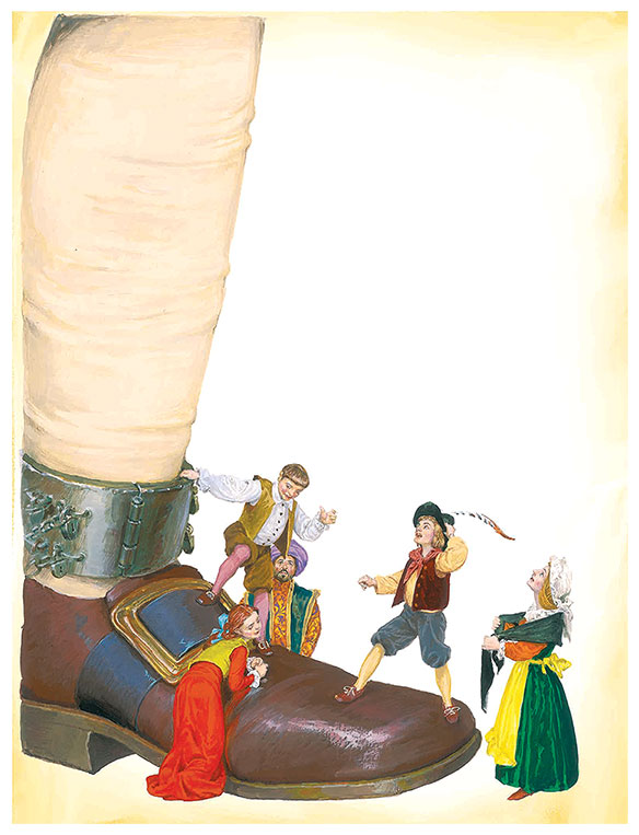 Одни осматривали каблуки Гулливера, другие швыряли в него камешками или целились из луков в его жилетные пуговицы.