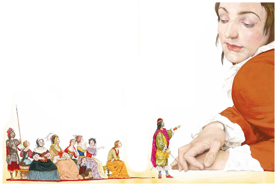 Вокруг неё на золотых скамеечках уселись её придворные дамы.